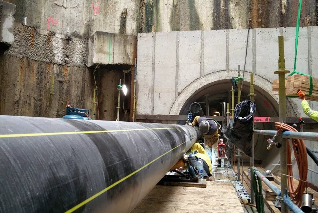 Utilities under the Albert Canal SOCEA pipes in position at one of the underground utility tunnels starting on the IJzerlaan and crossing the Albert Canal in Antwerp, BE.